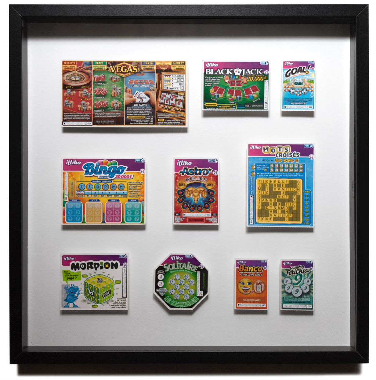 de tickets à gratter n'ayant jamais été grattés, présentés ensemble sous verre. Cette mise en exposition vise à